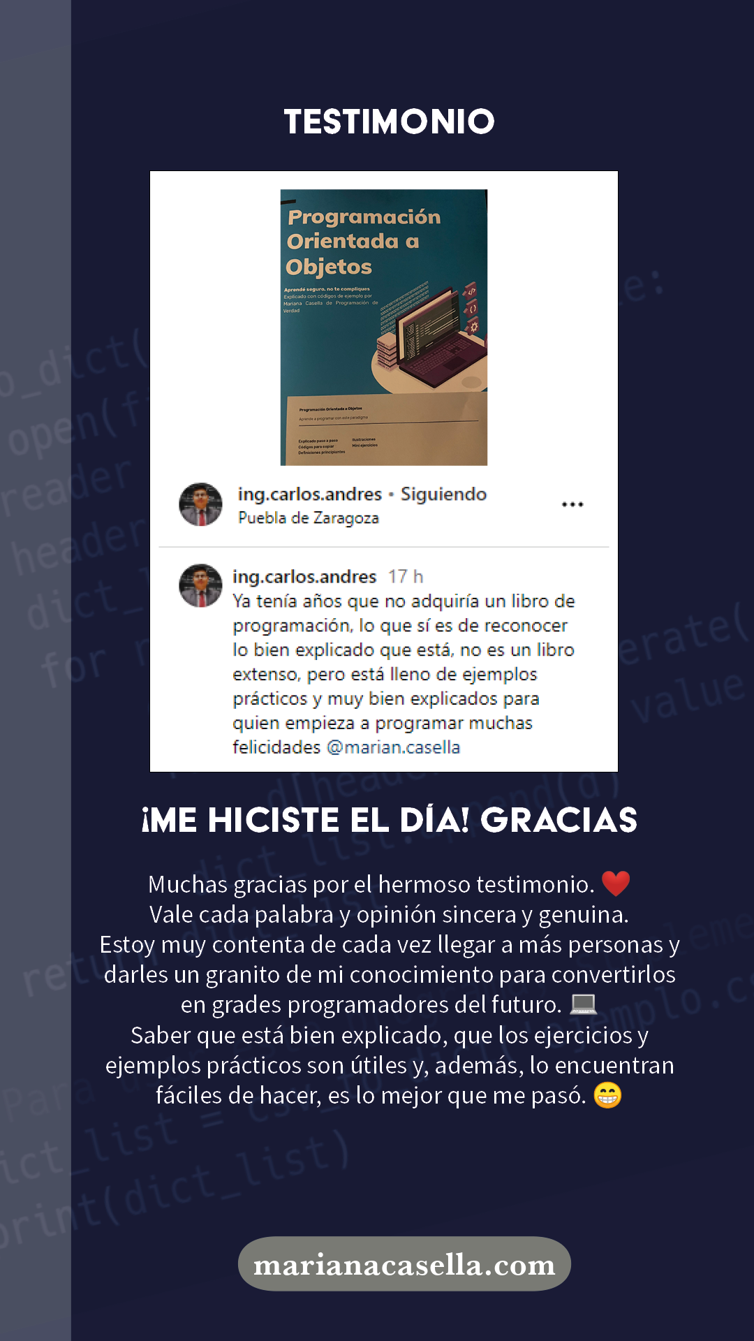 “Ya tenía años que no adquiría un libro de programación, lo que sí es de reconocer lo bien explicado que está. No es un libro extenso, pero está lleno de ejemplos prácticos y muy bien explicados para quien empieza a programar. Muchas felicidades @marian.casella”.
